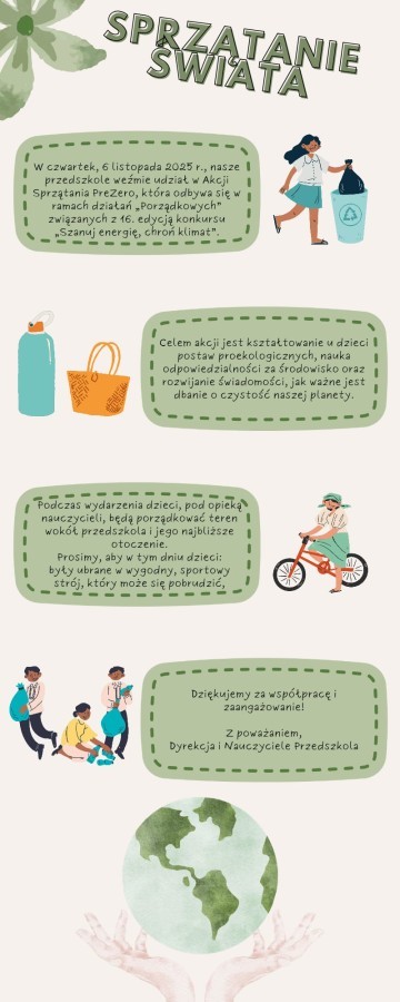 w czwartek, 6 listopada 2025 r., nasze przedszkole weźmie udział w Akcji Sprzątania PreZero, która odbywa się w ramach działań „Porządkowych” związanych z 16. edycją konkursu „Szanuj energię, chroń klimat”.