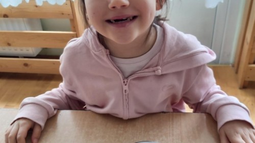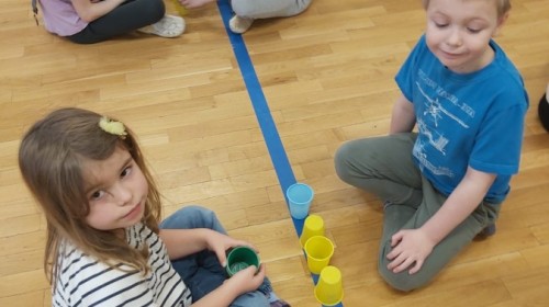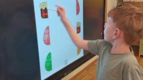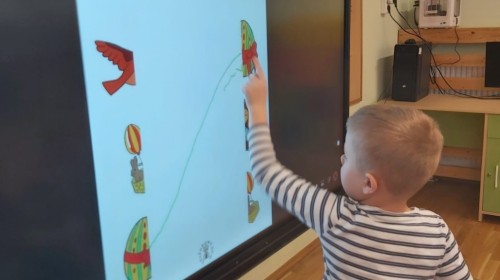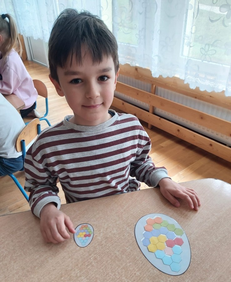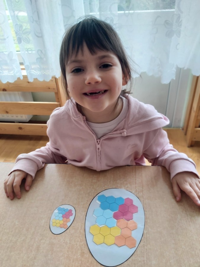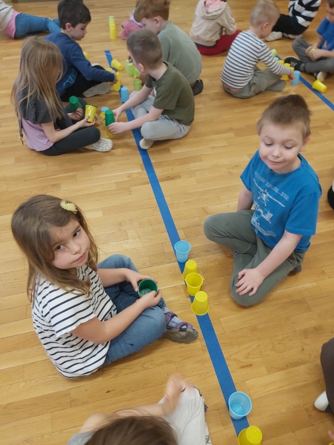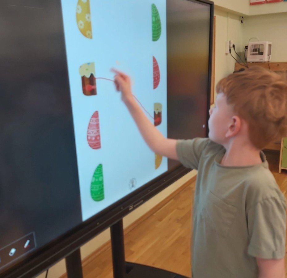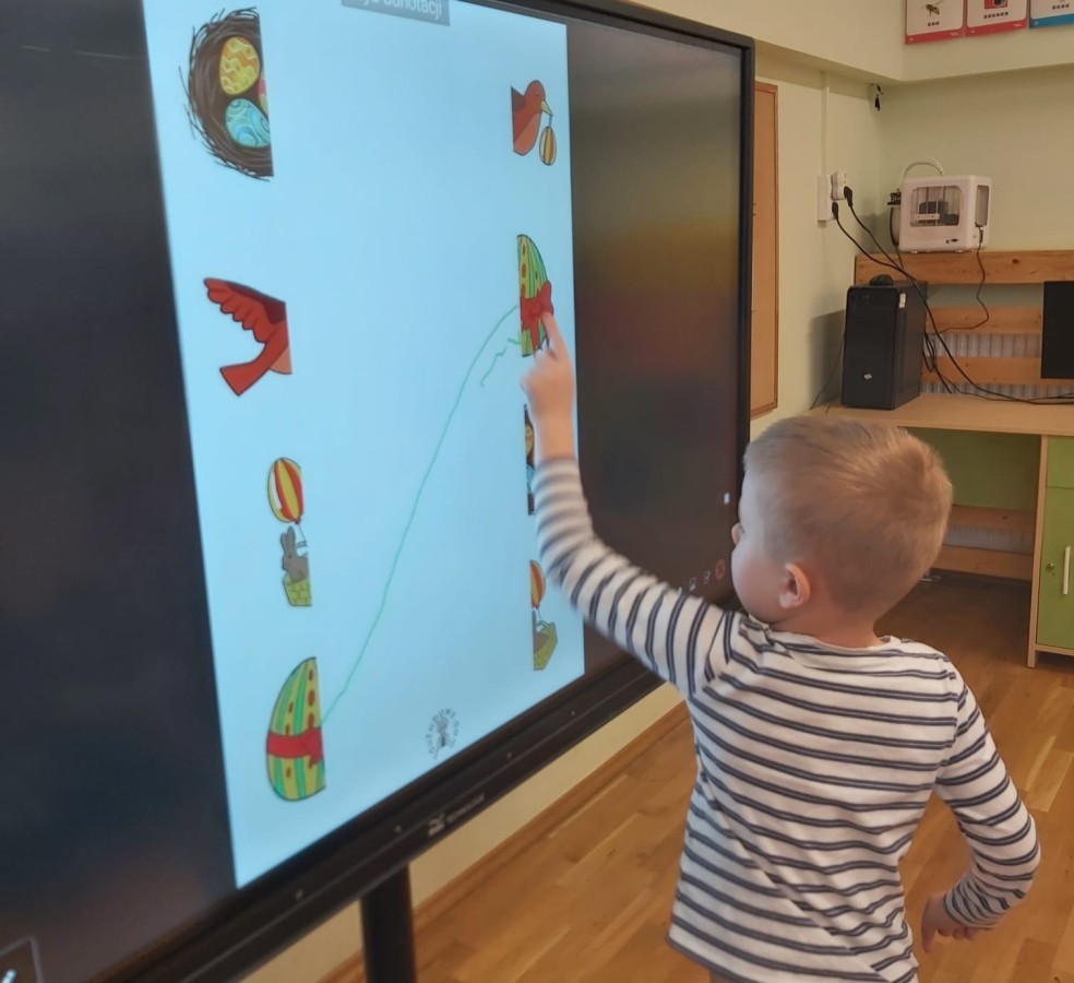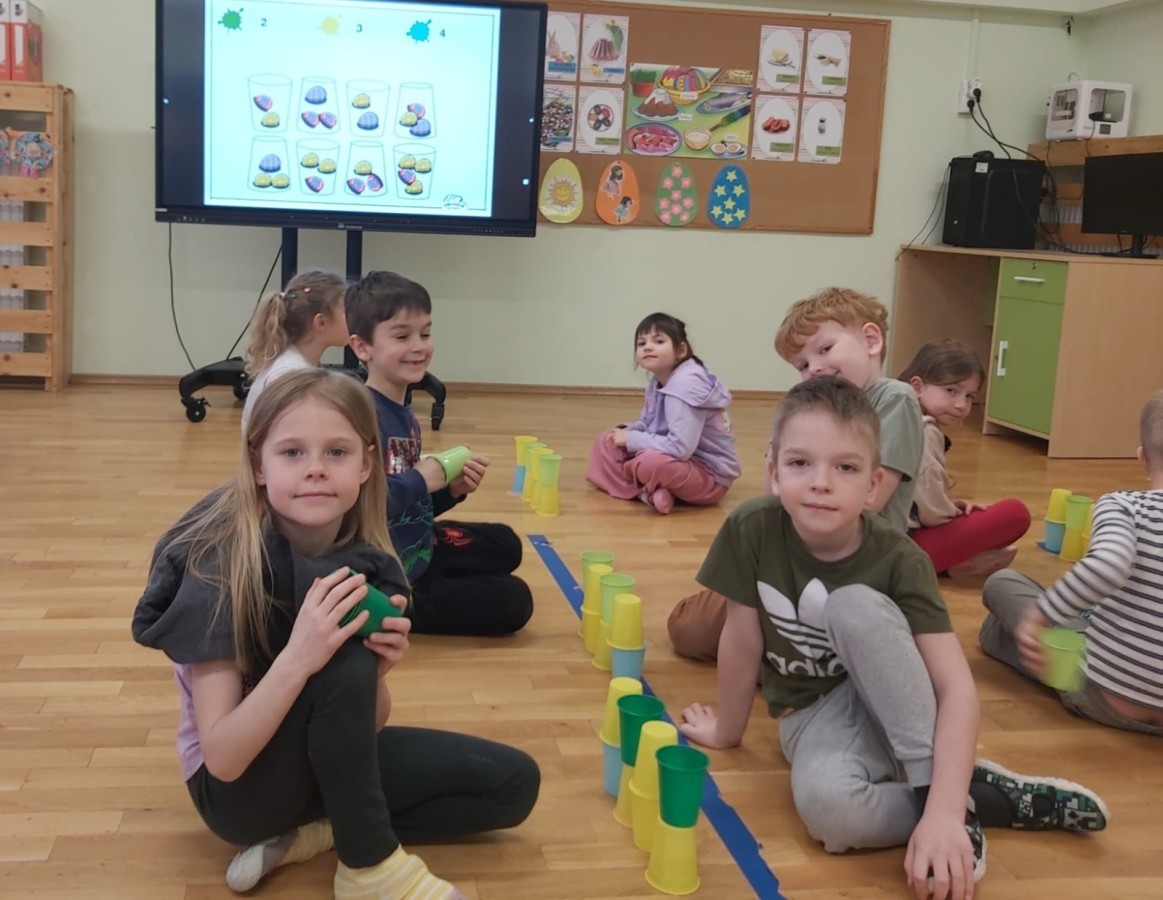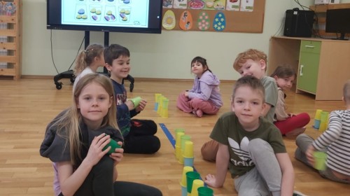 Nie zabrakło także aktywności rozwijających myślenie logiczne i kompetencje matematyczne. Dzieci uczestniczyły w zabawach z kodowaniem przy użyciu kubeczków, doskonaląc orientację przestrzenną oraz umiejętność planowania sekwencji działań. Przy wykorzystaniu tablicy interaktywnej łączyły ze sobą pasujące elementy, ćwicząc spostrzegawczość i koncentrację uwagi. Dodatkowo układały „jajka Tetris”, co stanowiło doskonałe ćwiczenie rozwijające logiczne myślenie, analizę i dopasowywanie kształtów.
