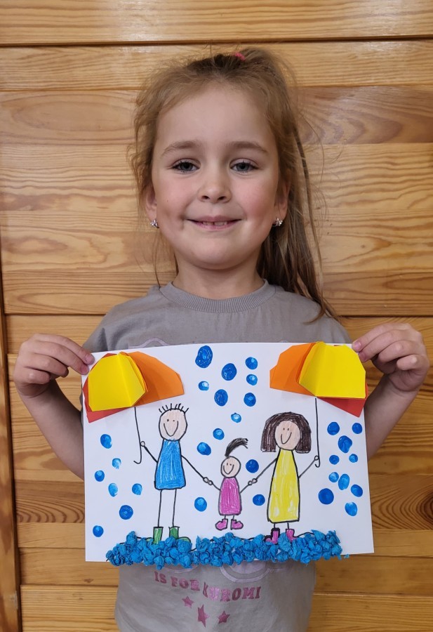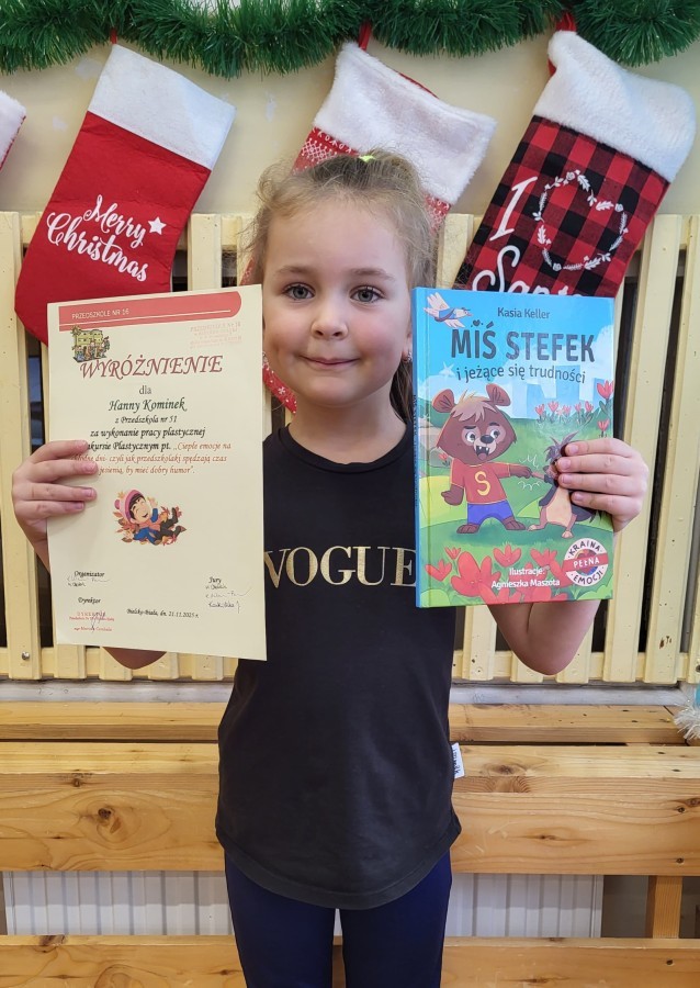 Hanna Kominek z grupy Pszczółki zdobyła wyróżnienie w konkursie plastycznym "Ciepłe emocje na chłodne dni, czyli jak przedszkolaki spędzają czas jesienią, by mieć dobry humor" organizowanym przez Przedszkole nr 16 w Bielsku-Białej.