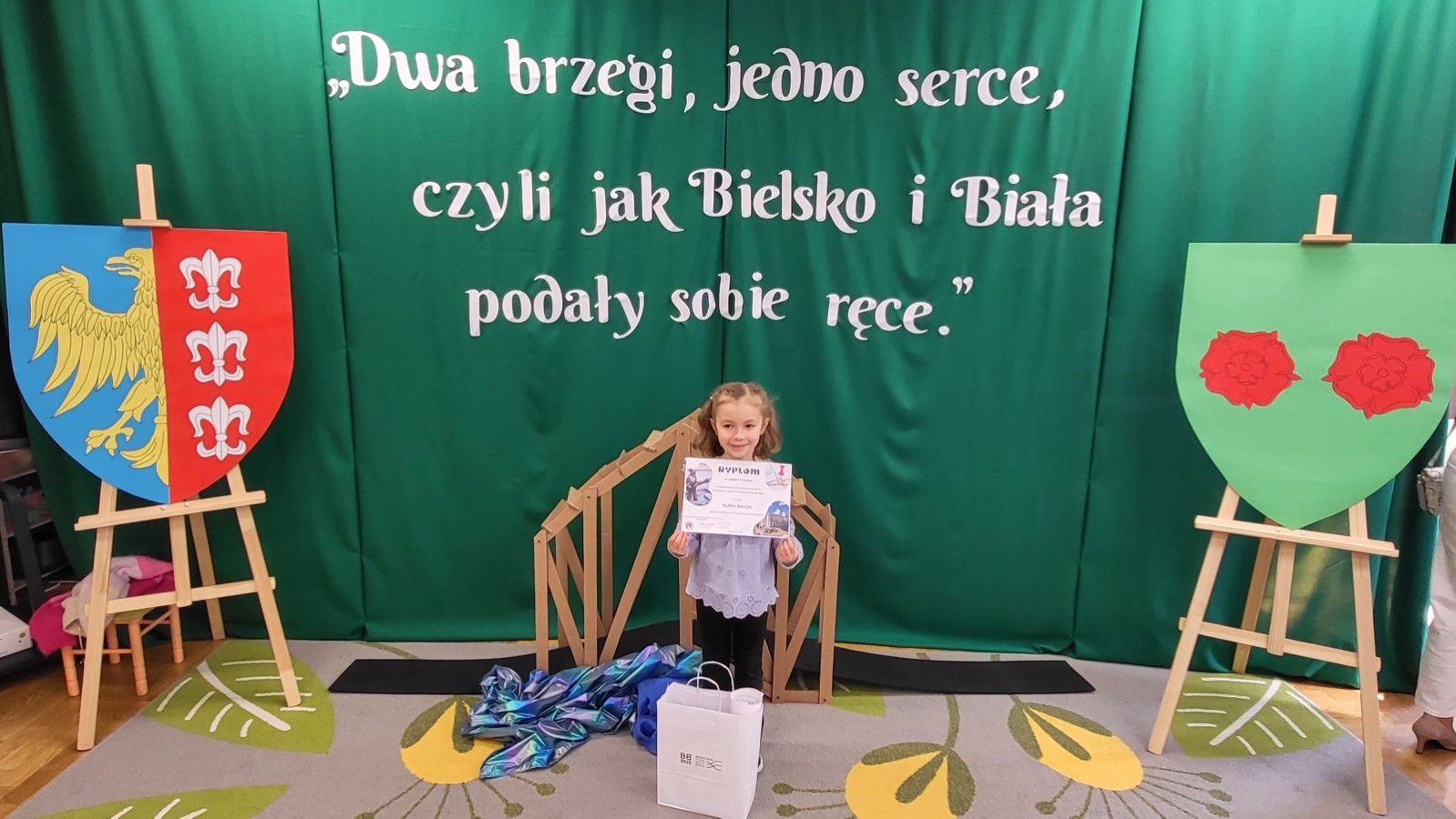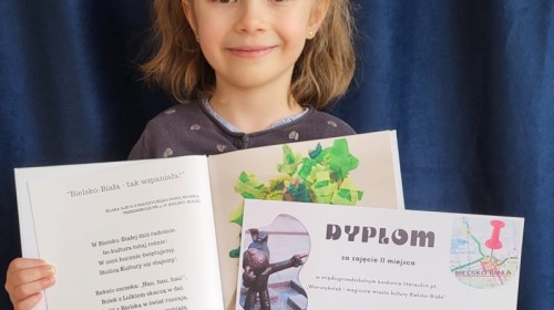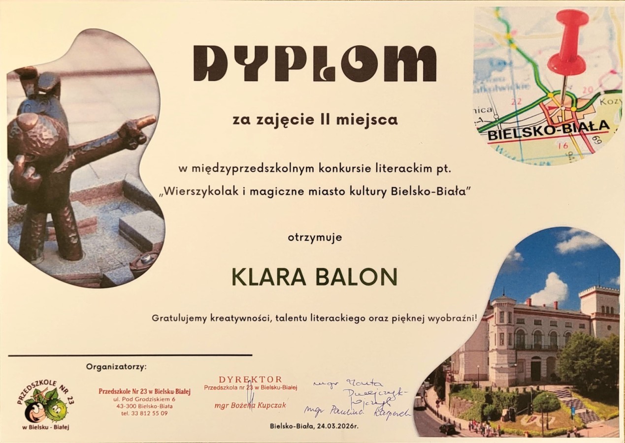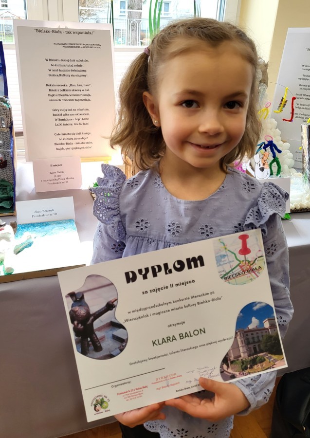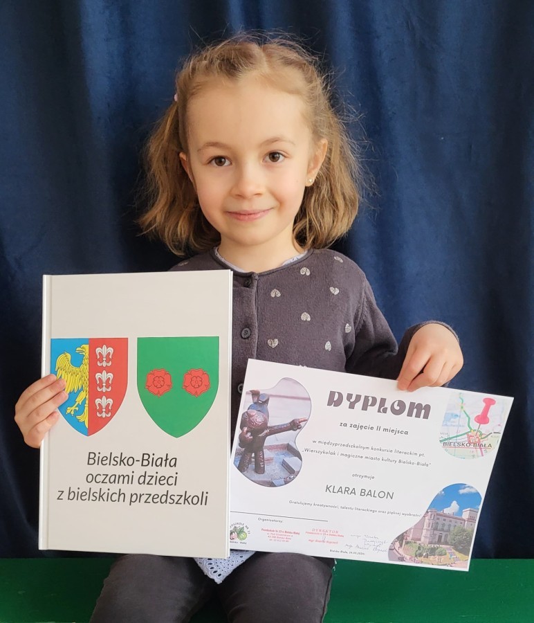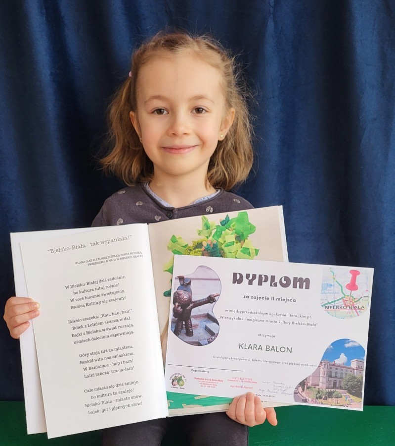 Klara z grupy „Pszczółki” odniosła wspaniały sukces, zdobywając II miejsce w konkursie literackim „Wierszykolak i magiczne miasto kultury Bielsko-Biała”. Jej wyjątkowy wierszyk, pełen dziecięcej wyobraźni, wrażliwości i radości tworzenia, powstał przy wsparciu nauczycielki Pani Moniki Dyczek, która towarzyszyła jej w rozwijaniu twórczego potencjału. To osiągnięcie jest nie tylko powodem do dumy dla Klary, ale także pięknym przykładem, jak współpraca, zaangażowanie i pasja mogą prowadzić do niezwykłych rezultatów. Serdecznie gratulujemy i życzymy dalszych sukcesów.