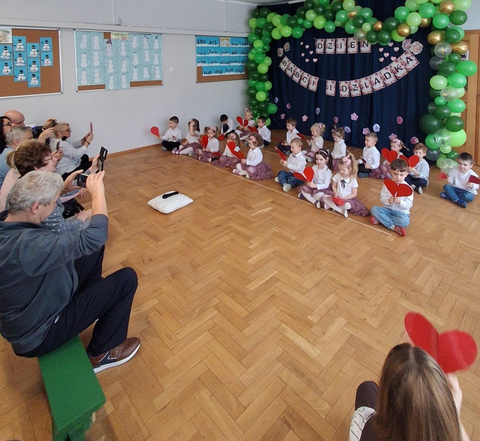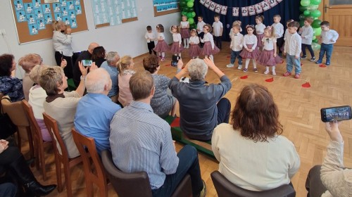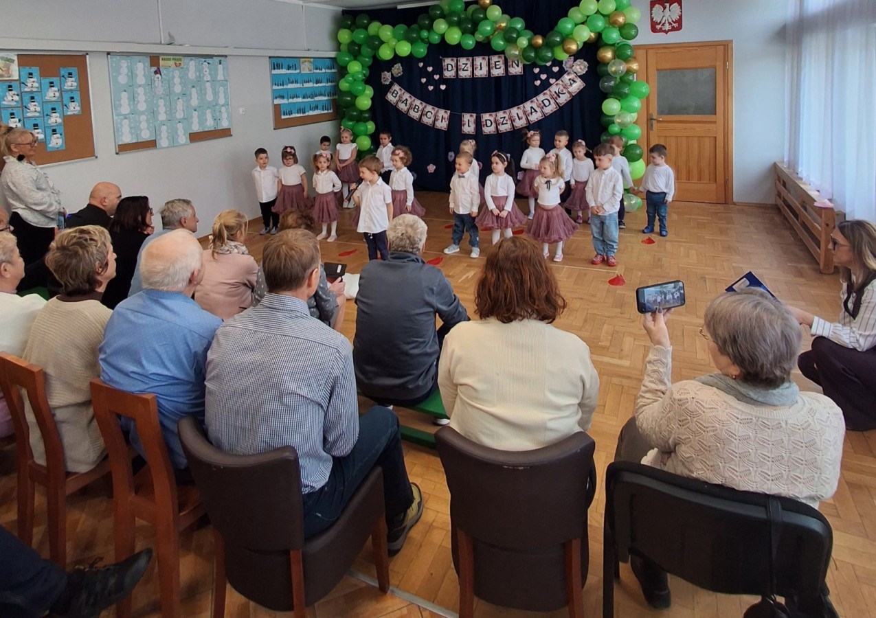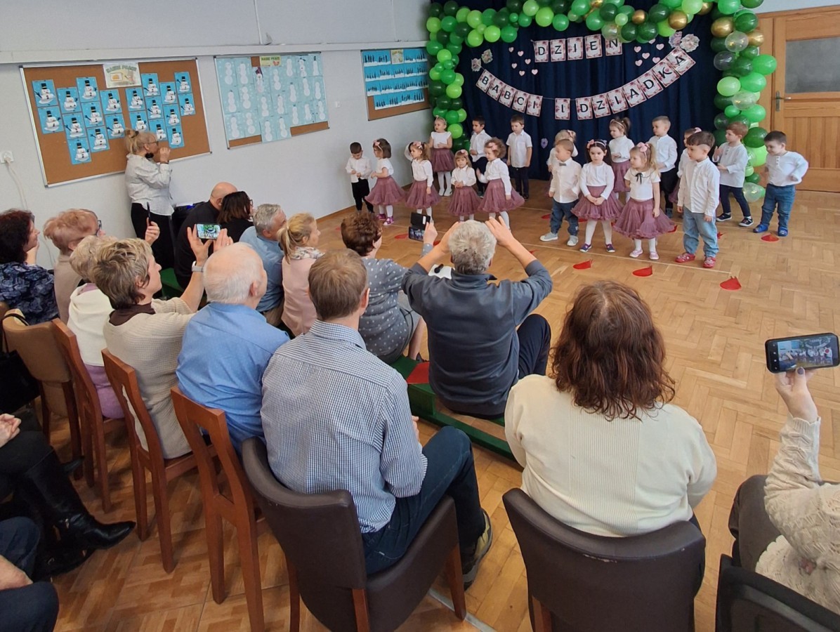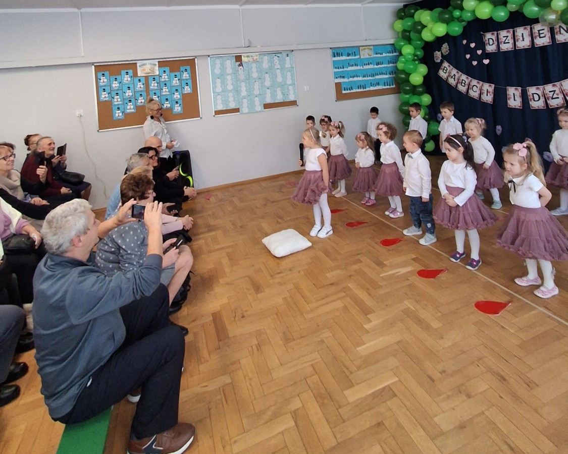 Dzień Babci i Dziadka w grupie Myszek był wyjątkowym i bardzo wzruszającym wydarzeniem. Dzieci z ogromnym zaangażowaniem zaprezentowały przygotowany program artystyczny, na który złożyły się krótkie wierszyki, piosenki oraz proste układy ruchowe. Występ odbył się w serdecznej, ciepłej atmosferze, pełnej uśmiechów, radości i dumy ze strony zaproszonych gości.