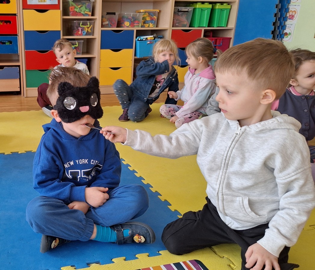 W ramach projektu edukacyjnego „Gramy zmysłami” grupa Motylki poznawała kolejny zmysł – smak. Celem zajęć było rozwijanie percepcji smakowej, uwrażliwienie dzieci na różnorodność smaków oraz kształtowanie umiejętności rozpoznawania produktów spożywczych bez udziału wzroku.