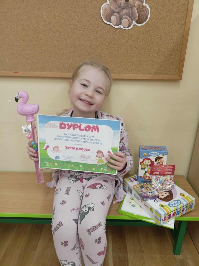 Zofia Bogusz z grupy Pszczółki wzięła udział w Międzyprzedszkolnym Konkursie "Flaga, godło i hymn - znam je dobrze" zorganizowanym prze Przedszkole nr 12 w Bielsku-Białej i zdobyła II miejsce. Serdecznie gratulujemy!!!