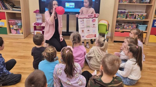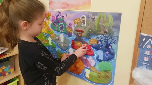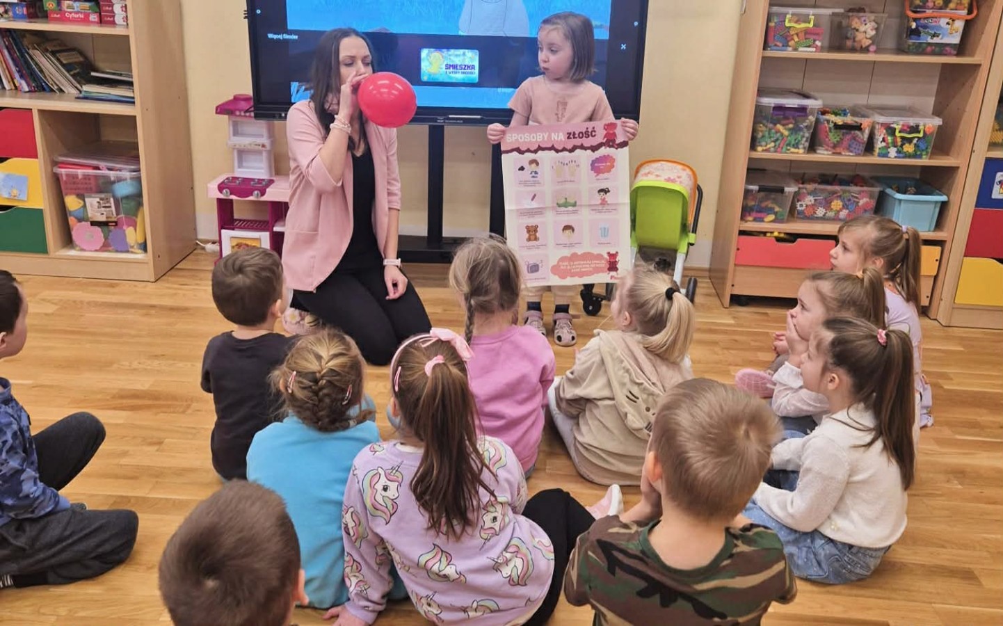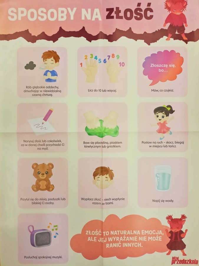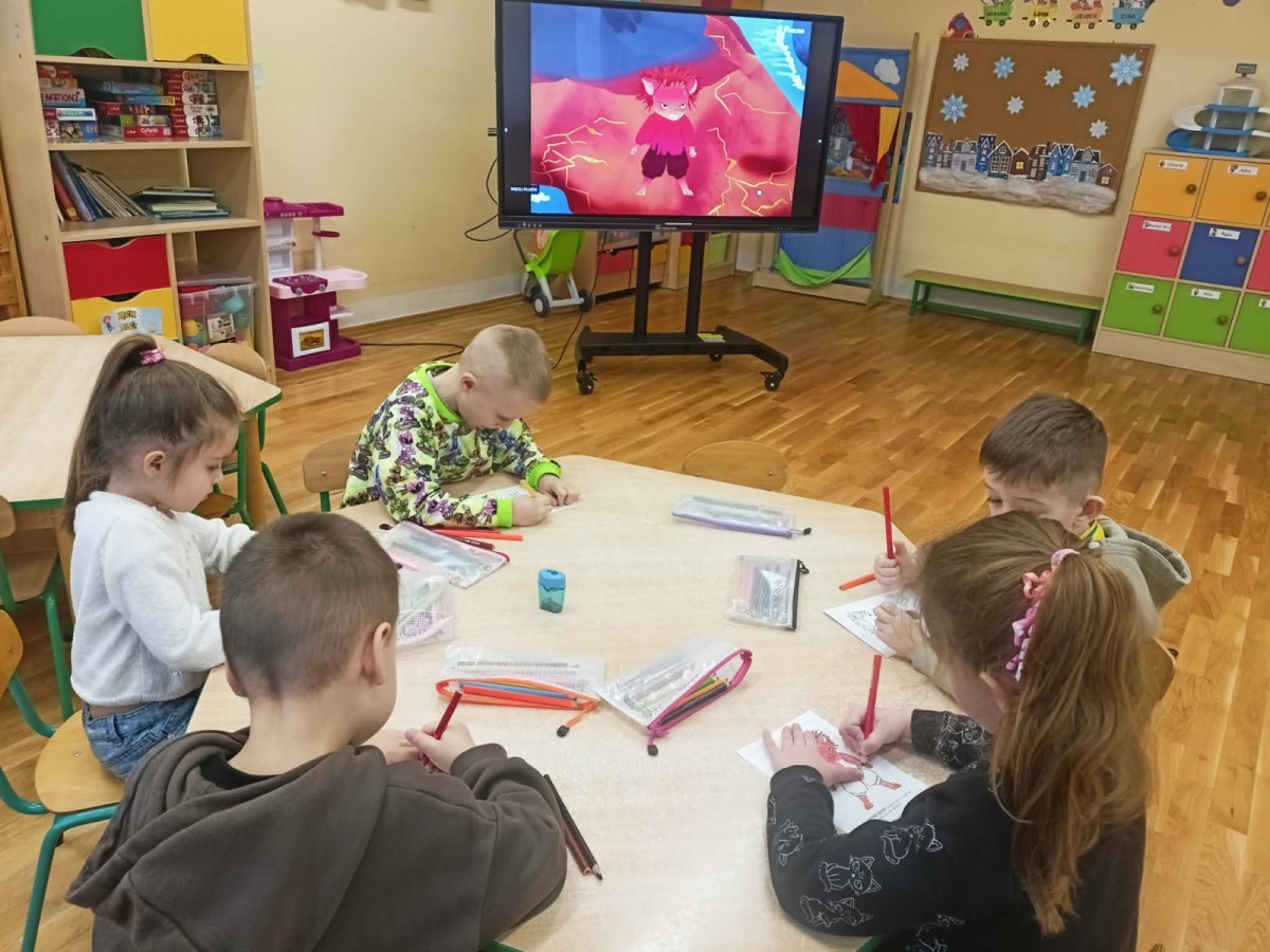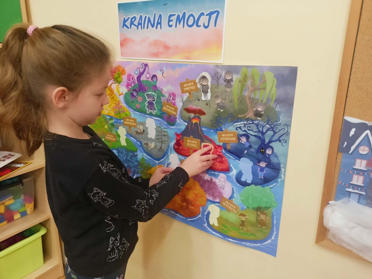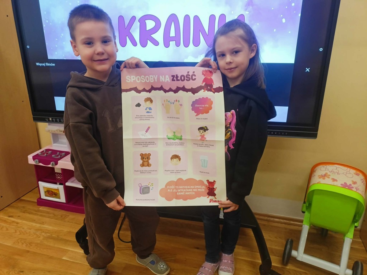 W naszej Krainie Emocji pojawił się kolejny mieszkaniec – Gniewek z Wyspy Złości. Dzieci wysłuchały bajki, która pomogła im zrozumieć, czym jest złość i kiedy może się pojawić. Rozmawialiśmy o przygodach bohaterki opowiadania oraz o tym, co czasem sprawia, że czujemy się źli. Dzieci wzięły także udział w prostym doświadczeniu z balonem, które pokazało, jak emocje mogą narastać, gdy ich nie zauważamy. Nasze Pszczółki wspólnie zastanawiały się, co pomaga im się uspokoić, gdy dopada je złość. Kolorowały postać Gniewka oraz rysowały swoje sposoby na wyciszenie emocji w książeczkach projektowych. Zajęcia były okazją do nauki nazywania emocji, spokojnego radzenia sobie z trudnymi uczuciami oraz okazywania empatii innym.