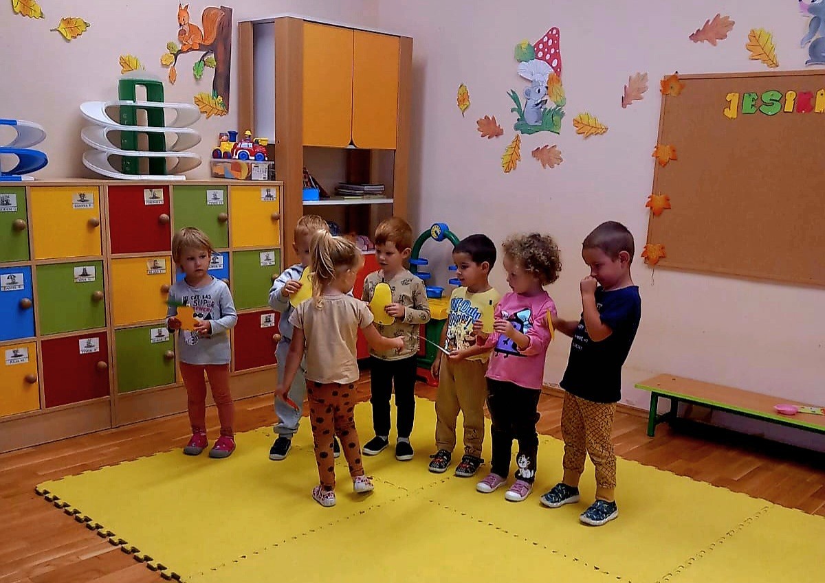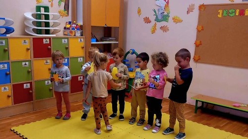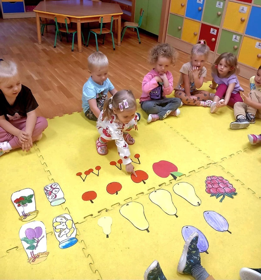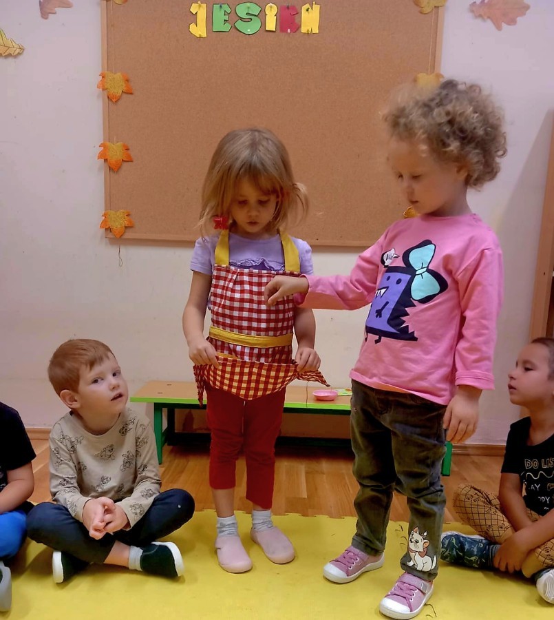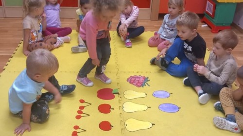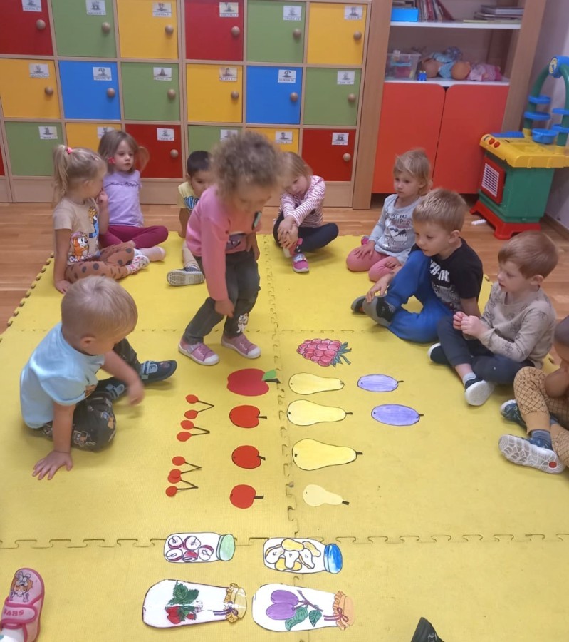 W ramach innowacji pedagogicznej prowadzonej w grupie Myszki ,,Matematyka na wesoło w świecie przedszkolaka,, w miesiącu październiku dzieci brały udział w zajęciach ,,Wesołe zabawy- orientuję się w przestrzeni". Dzieci uczyły się rozróżniać określenia dotyczące położenia przedmiotów z użyciem sylwet owoców, liczyły, poznały wierszyk ,,Wpadła gruszka do fartuszka". Zajęcia pozwoliły dzieciom swobodnie rozmawiać o tym, co się wokół nich znajduje oraz wspaniale się bawić.