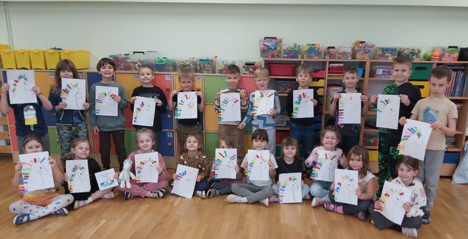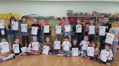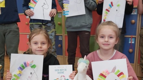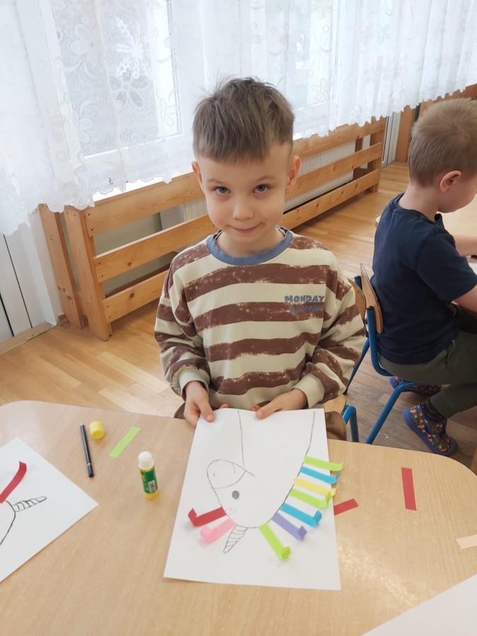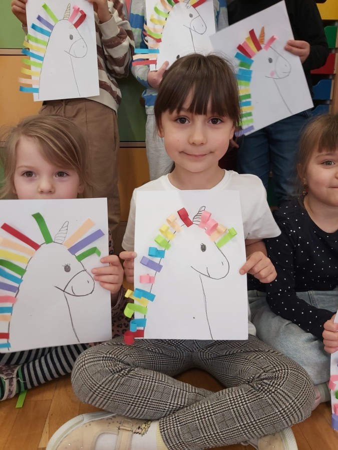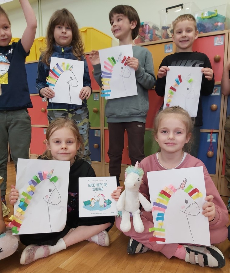 W ramach międzynarodowego projektu „Kolorowe uczucia Gucia – Gucio uczy się słuchać” dzieci uczestniczyły w różnorodnych aktywnościach rozwijających umiejętność uważnego słuchania, rozpoznawania emocji oraz empatycznej komunikacji. Zadanie realizowane było poprzez wspólne czytanie opowiadania o Guciu, rozmowy kierowanej, zabawy dydaktycznej " Gluchy telefon" i ruchowej "Zrób to co powiem" . Dzieci uczyły się, jak słuchać innych, wyrażać własne emocje oraz reagować na uczucia rówieśników. Na zakończenie dzieci wykonały pracę plastyczną przedstawiającą Gucia z kolorową grzywą, wykonaną z kolorowego papieru, symbolizującą różnorodność emocji.