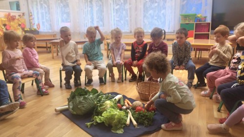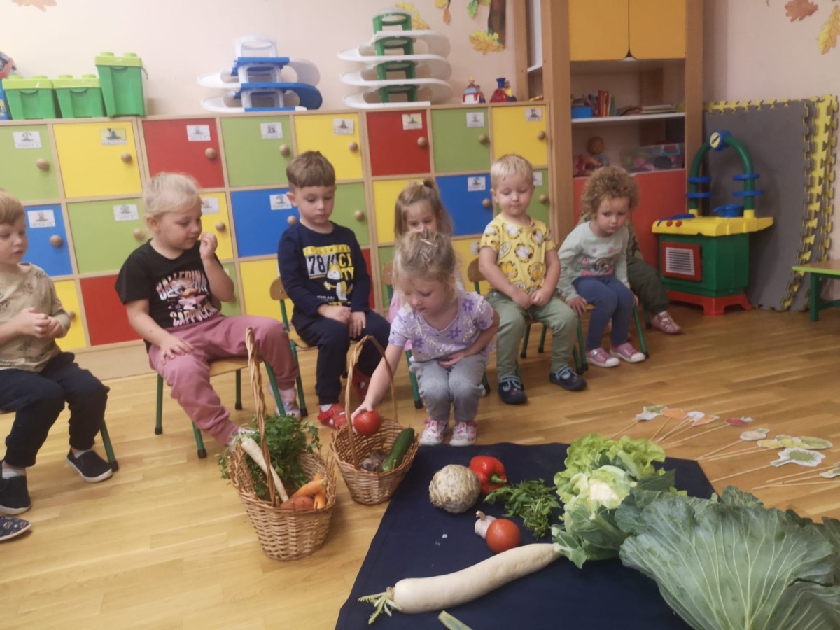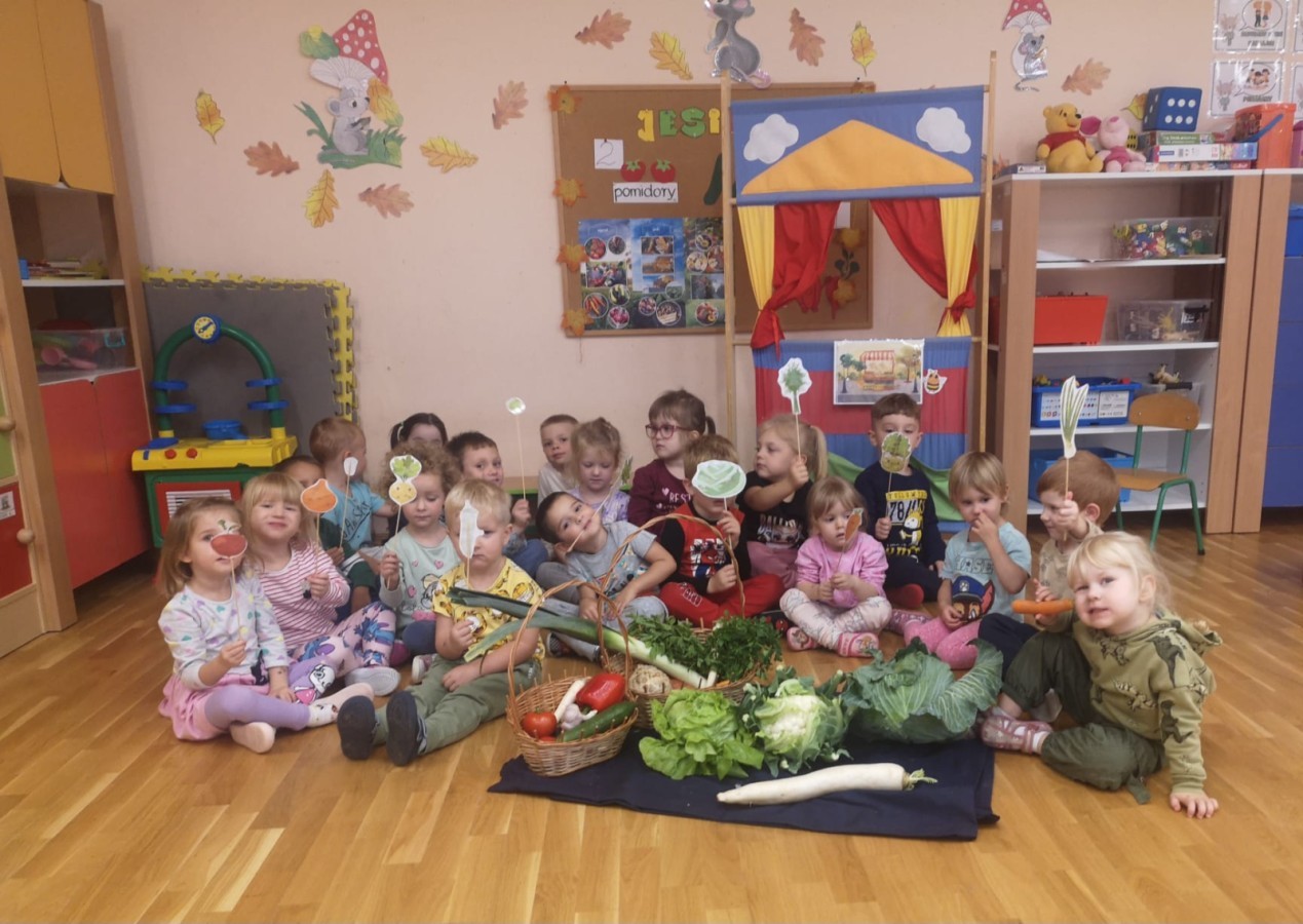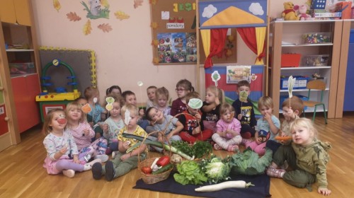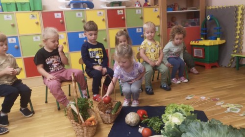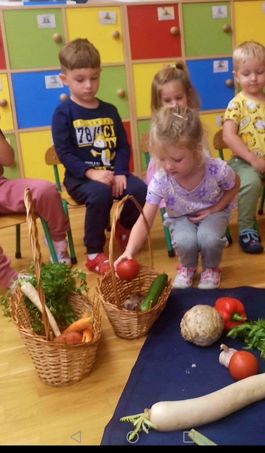 We wtorek 7 października w grupie MYSZKI odbyły się zajęcia o Warzywach, które pomogły dzieciom poznać różne rodzaje warzyw, ich walory odżywcze, sposoby przetwarzania i konieczność spożywania ich na co dzień. Odbył się teatrzyk z sylwetami warzyw na podstawie wiersza J. Brzechwy ,,Na straganie". Dzieci rozpoznawały warzywa za pomocą zmysłów (dotyk, węch, smak), dzieliły warzywa na grupy według rodzaju, kształtu, koloru, rozwiązywały zagadki słowne o warzywach oraz tworzyły prace plastyczne związane z warzywami.