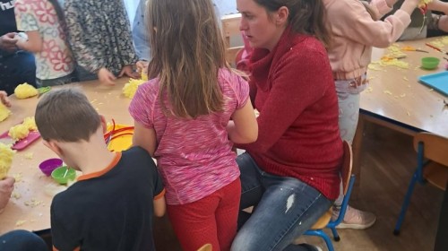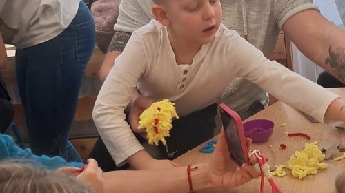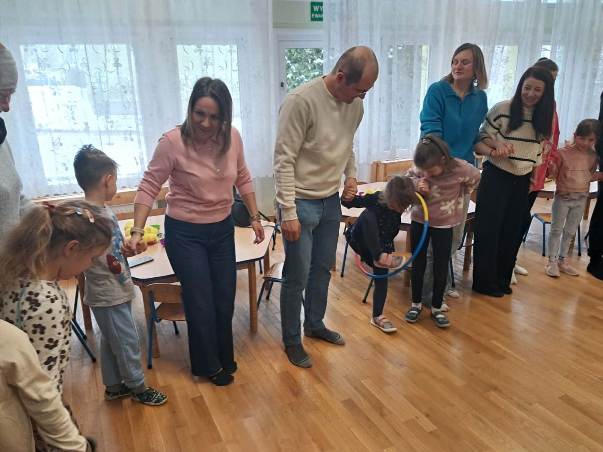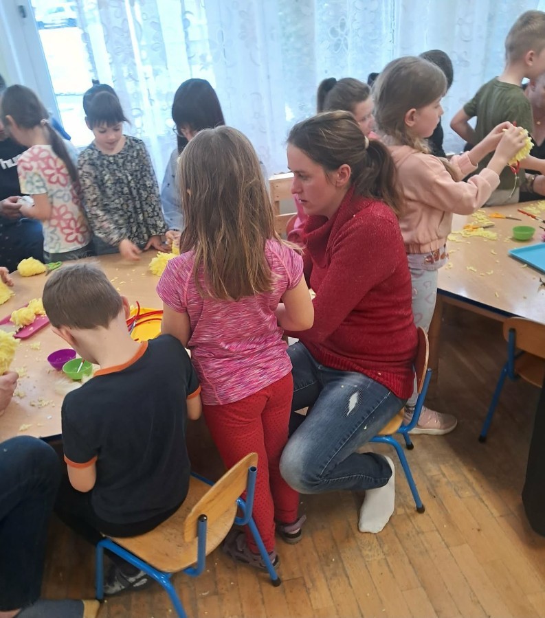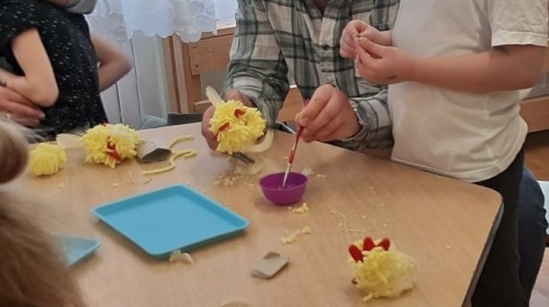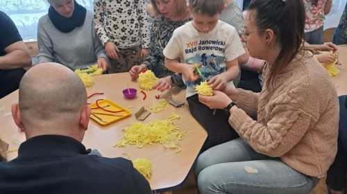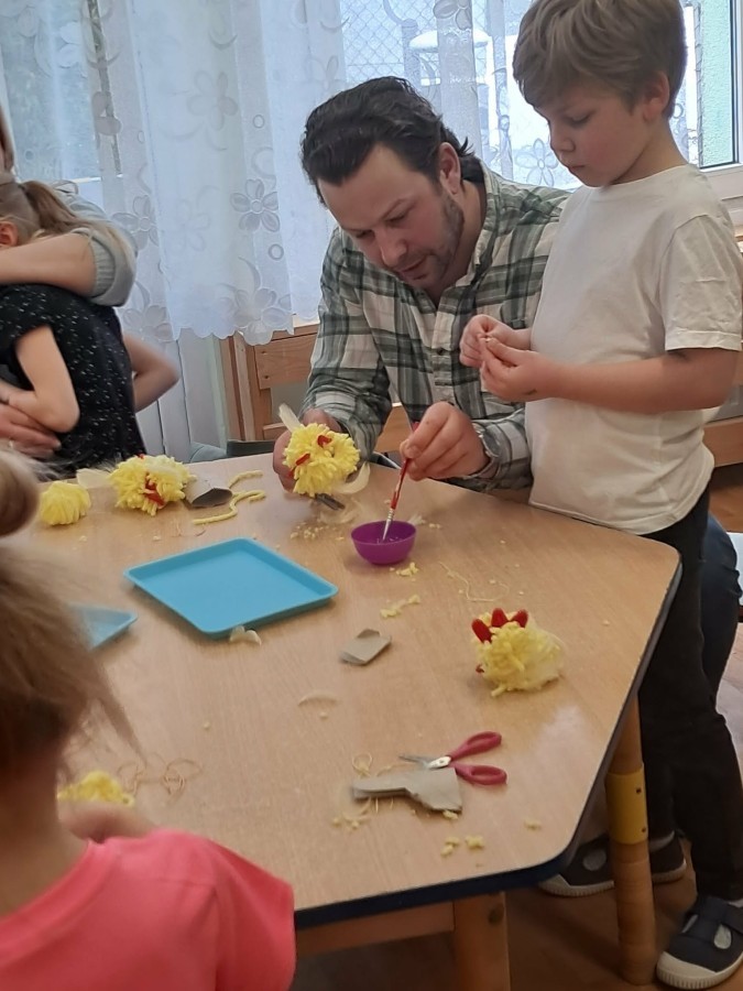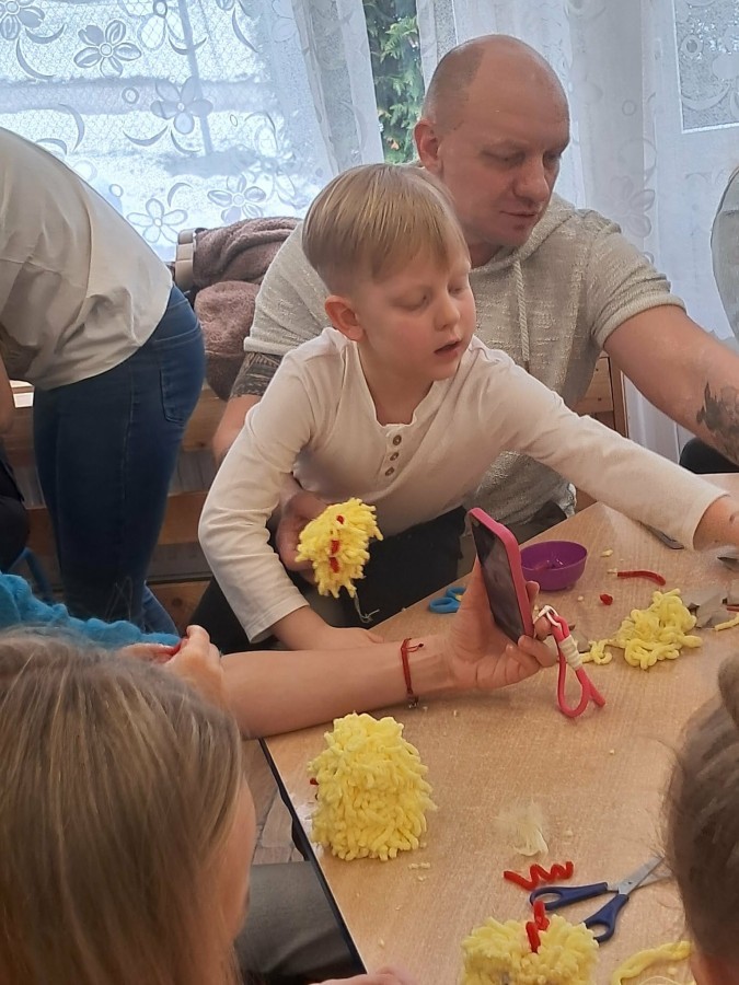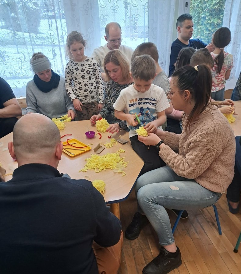 W trakcie warsztatów nie zabrakło różnorodnych aktywności – dzieci i rodzice wspólnie układali pisanki, odczytując ukryte wyrazy, a także brali udział w pełnym emocji wyścigu z jajkiem. Dużo radości przyniosła również część plastyczna, podczas której powstały urocze kurczaczki z muliny.