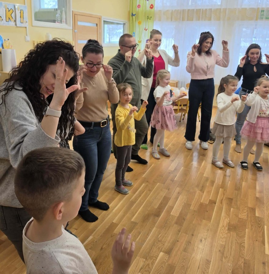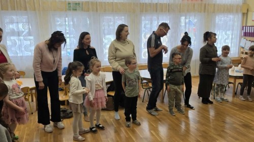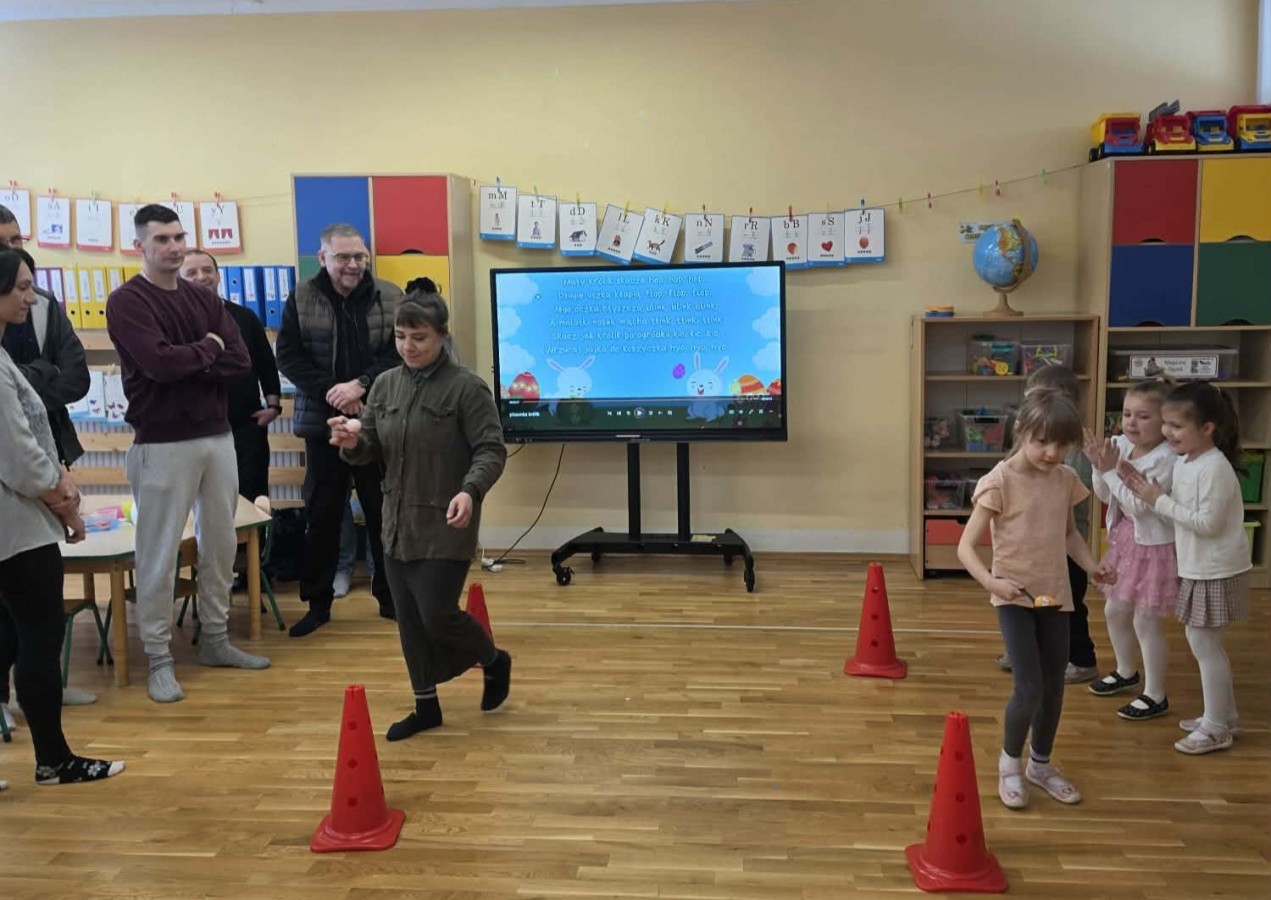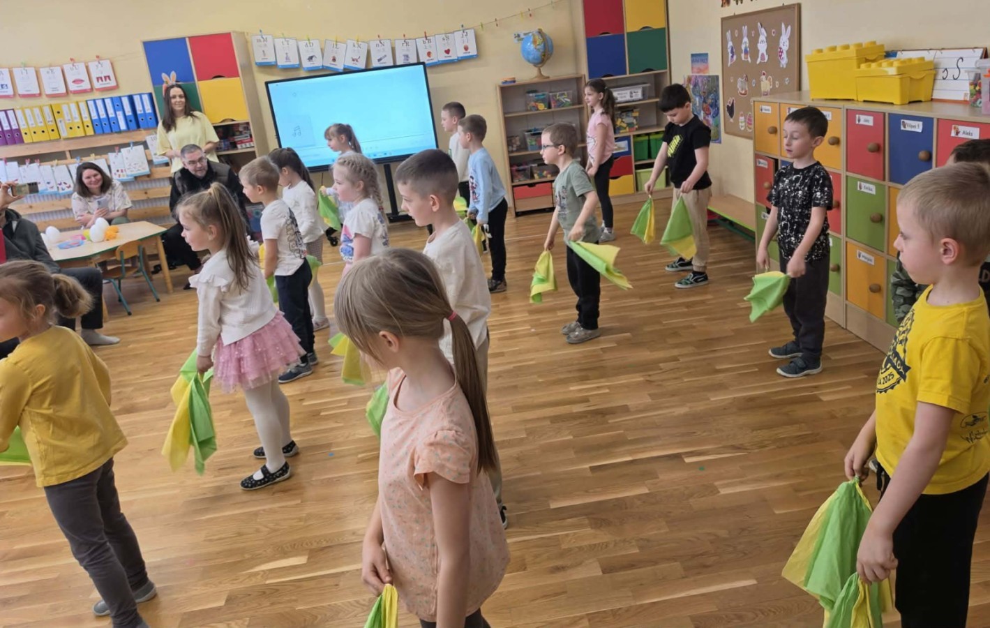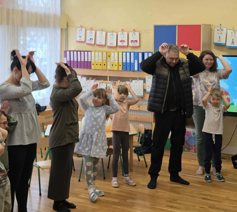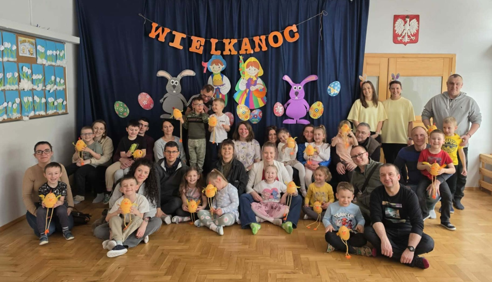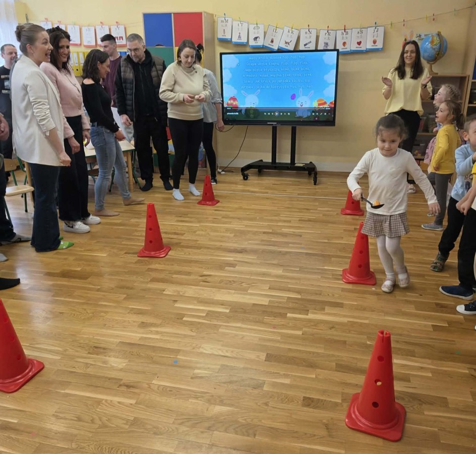 Grupa „Pszczółki” zaprosiła swoich rodziców na wyjątkowe warsztaty wielkanocne w przedszkolu. Spotkanie upłynęło w radosnej i pełnej energii atmosferze – nie zabrakło wspólnych tańców oraz emocjonujących wyścigów z pisanką, które dostarczyły wszystkim wielu uśmiechów i dobrej zabawy.
