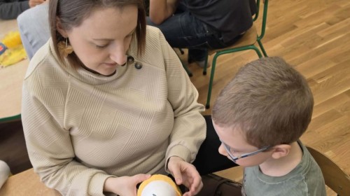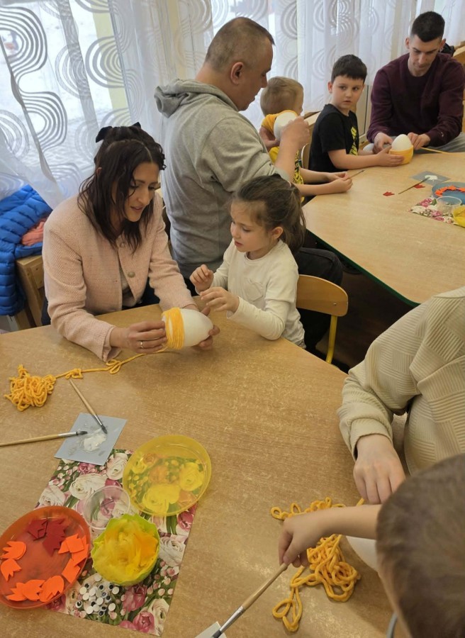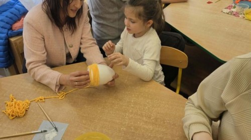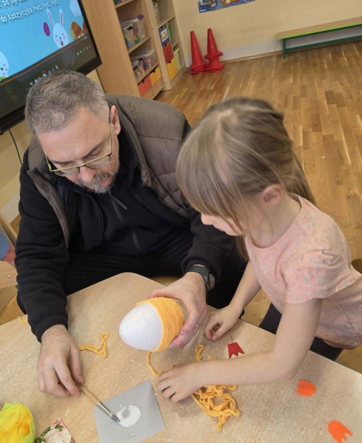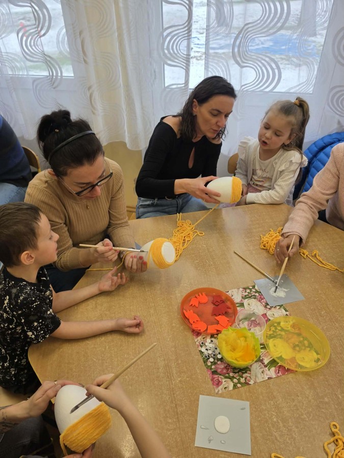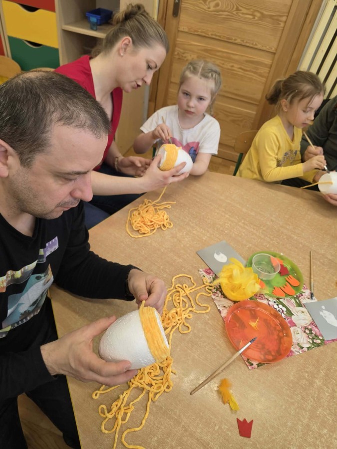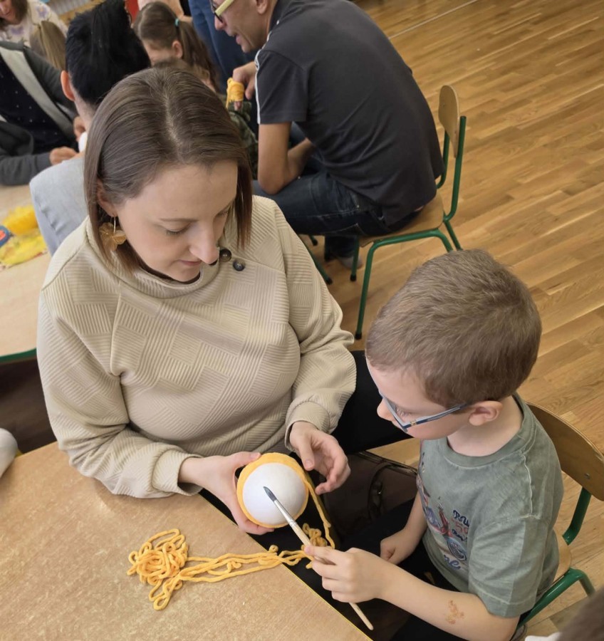 Najważniejszym punktem wydarzenia była jednak część plastyczna, podczas której dzieci wraz z rodzicami wykonały piękne kurki z jajek styropianowych. Powstałe prace zachwycały pomysłowością i starannością wykonania, a już wkrótce staną się wyjątkową ozdobą wielkanocnych stołów.