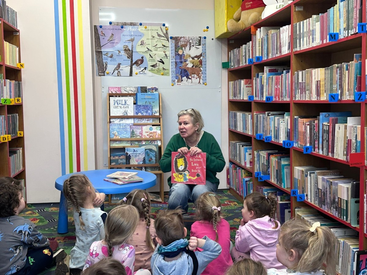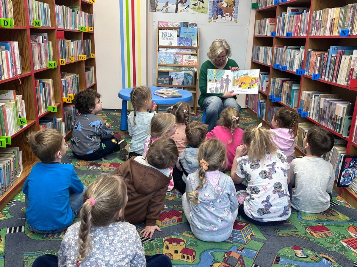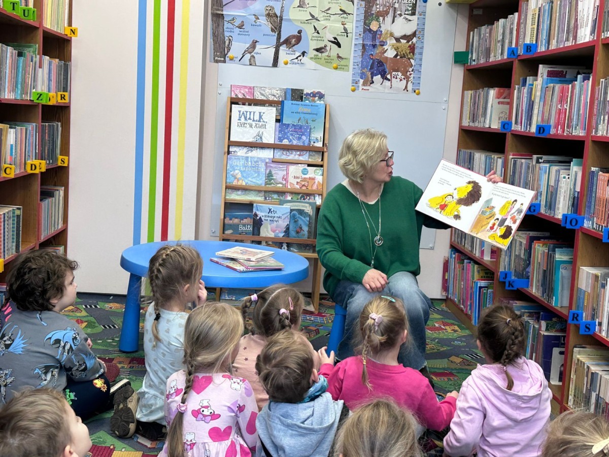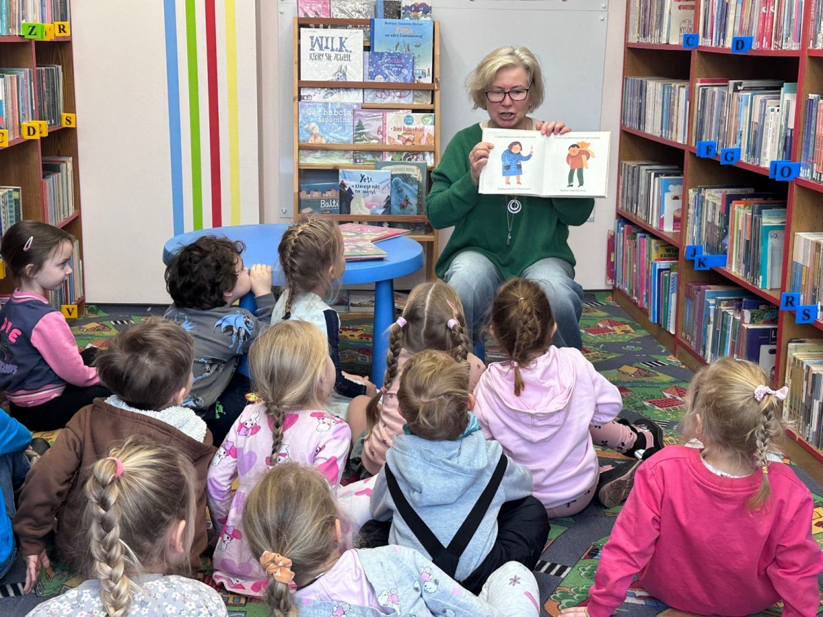 Dzieci z grupy „Motylki” wyruszyły na niezwykłą wycieczkę do biblioteki. Już na wejściu przywitała je uśmiechnięta pani bibliotekarka, która opowiedziała dzieciom, jak można wypożyczać książki i jak o nie dbać. Największą atrakcją okazało się wspólne czytanie – pani przeczytała dzieciom wspaniałą, pełną ciepła opowieść o babciach i dziadkach. Motylki słuchały z zapartym tchem, a ich oczy błyszczały ciekawością i radością.