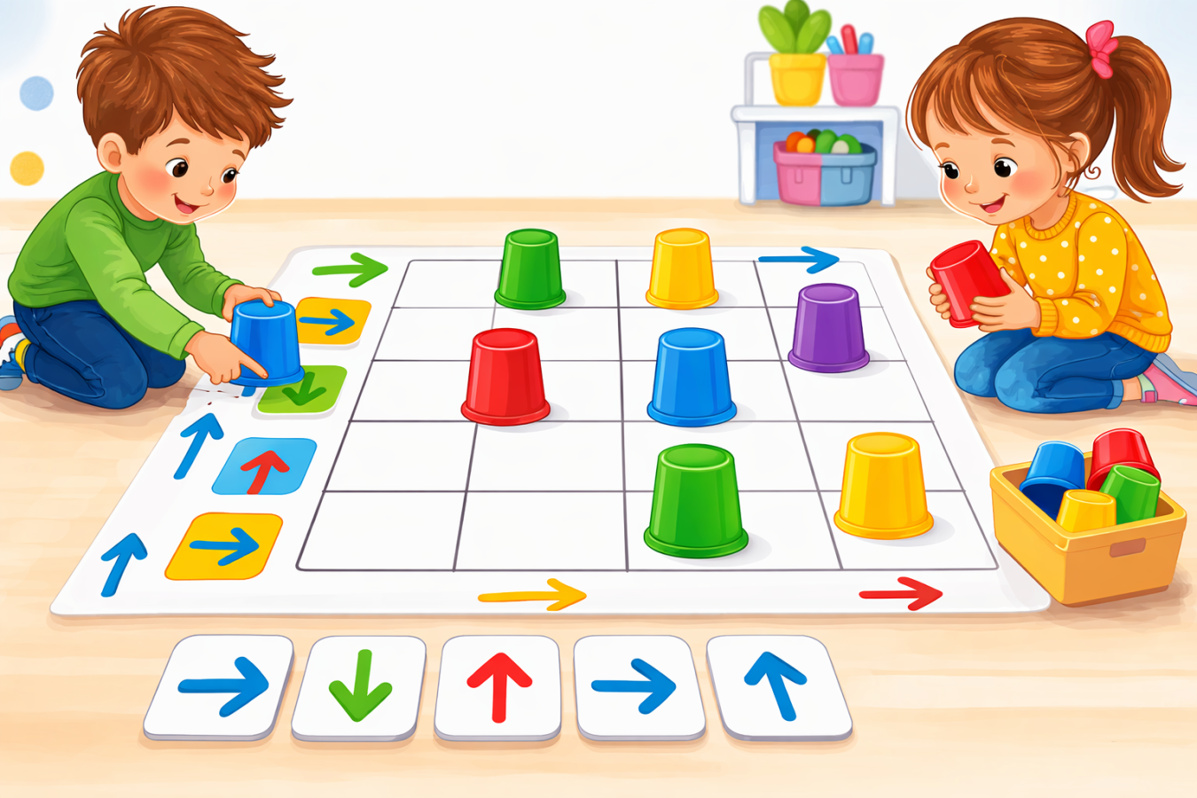 Podczas zajęć Pszczółki rozwijały logiczne myślenie i umiejętności matematyczne. Dzieci układały na macie figury według określonych zasad, ćwiczyły położenie przedmiotów w przestrzeni, a także rozwiązywały proste działania matematyczne, wykorzystując kolorowe kubeczki. To była świetna zabawa rozwijająca spostrzegawczość i koncentrację.