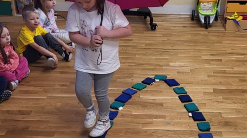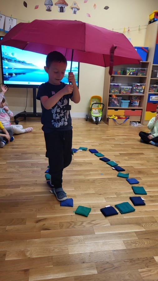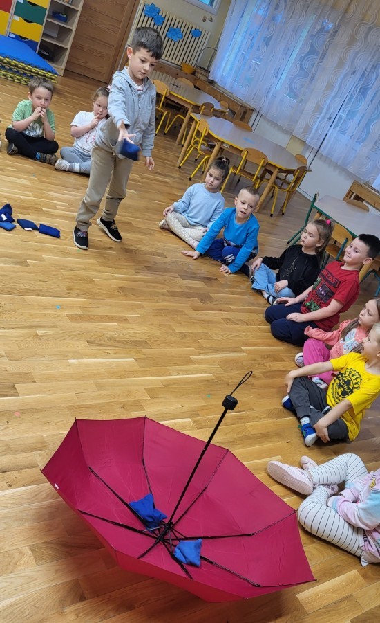 W części ruchowej przedszkolaki rzucały woreczkami do wnętrza rozłożonego parasola, ćwicząc celność i koordynację. Kolejną atrakcją był spacer po śladzie kropli ułożonej z woreczków – oczywiście z otwartym parasolem w dłoni, co wywołało wiele radości.