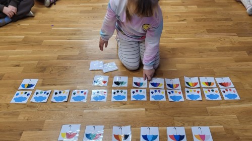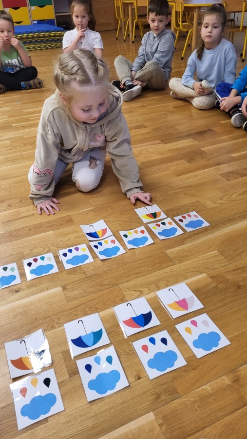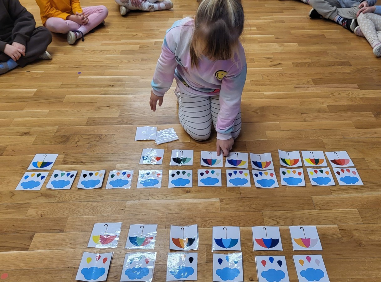Później dzieci przystąpiły do zabawy „Kolorowe parasolki”. Każdy musiał dopasować parasolkę do obrazka z kroplami deszczu tak, aby kolory idealnie do siebie pasowały, co doskonale ćwiczyło spostrzegawczość.