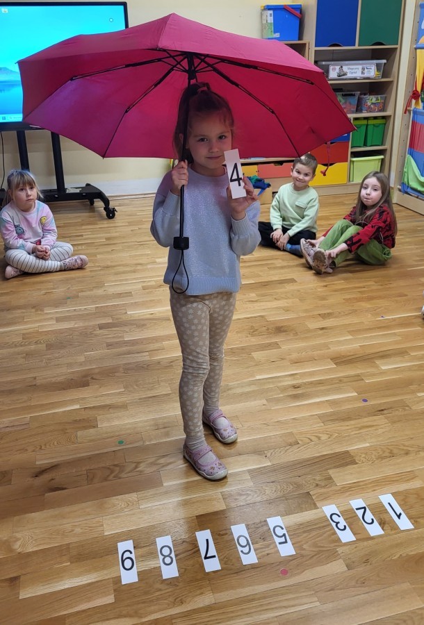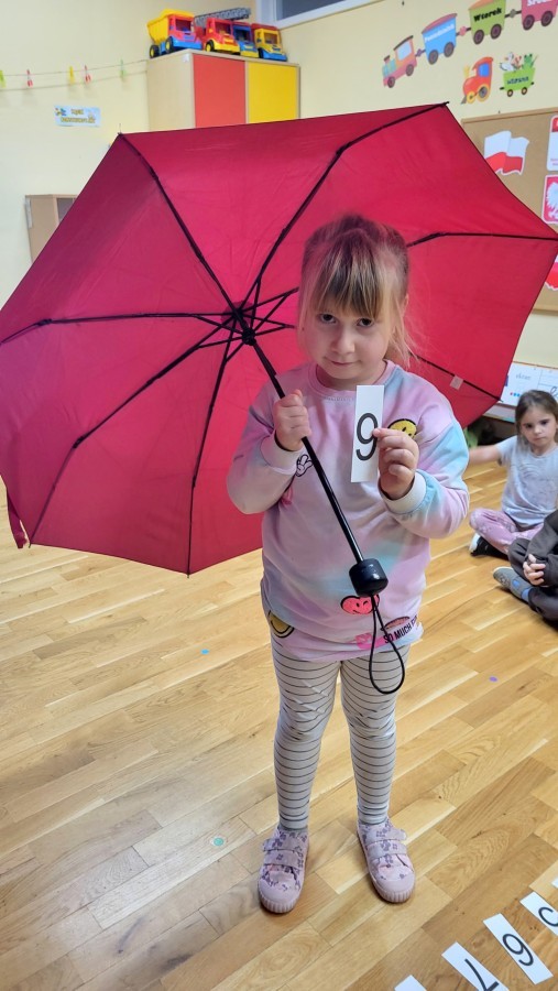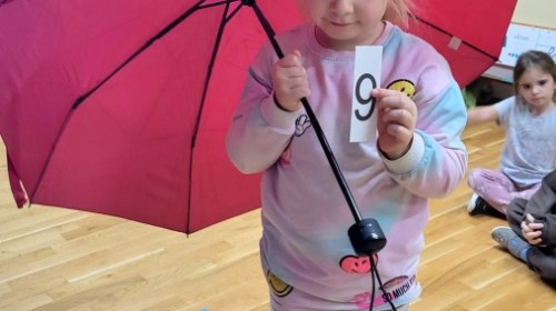 Na zakończenie odbyła się zabawa słuchowo-matematyczna. Dziecko stawało pod parasolem, a nauczyciel, koleżanka lub kolega delikatnie w niego uderzał. Zadaniem było policzyć ilość uderzeń i wybrać odpowiednią cyfrę.