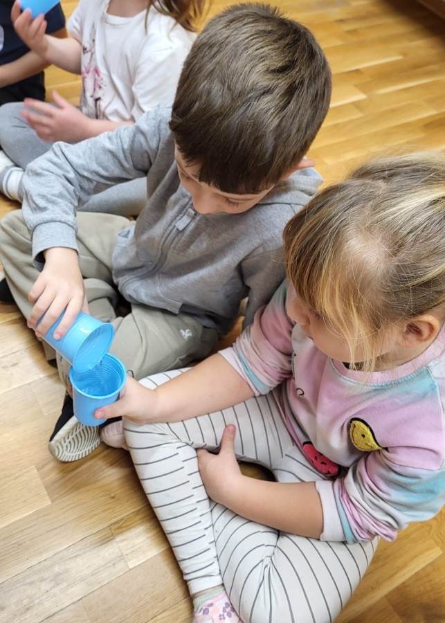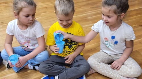 Następnie dzieci usiadły w kręgu, trzymając w dłoniach kubeczki. W pierwszej zabawie przekazywały sobie z kubeczka do kubeczka lekko nadmuchany balonik – „kroplę deszczu”. Wymagało to delikatności, skupienia i współpracy. W kolejnej części aktywności przedszkolaki „przelewały deszczyk”, podając sobie zawartość kubeczków tak, aby nic nie rozlać. Obie zabawy świetnie rozwijały koordynację, cierpliwość oraz umiejętność wspólnego działania.