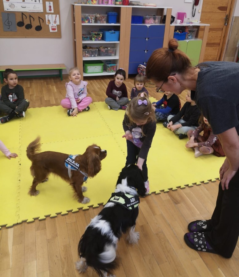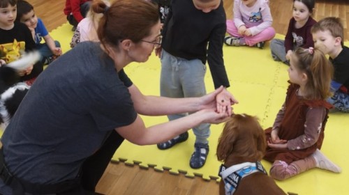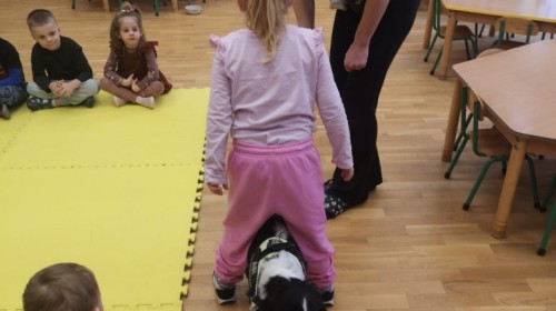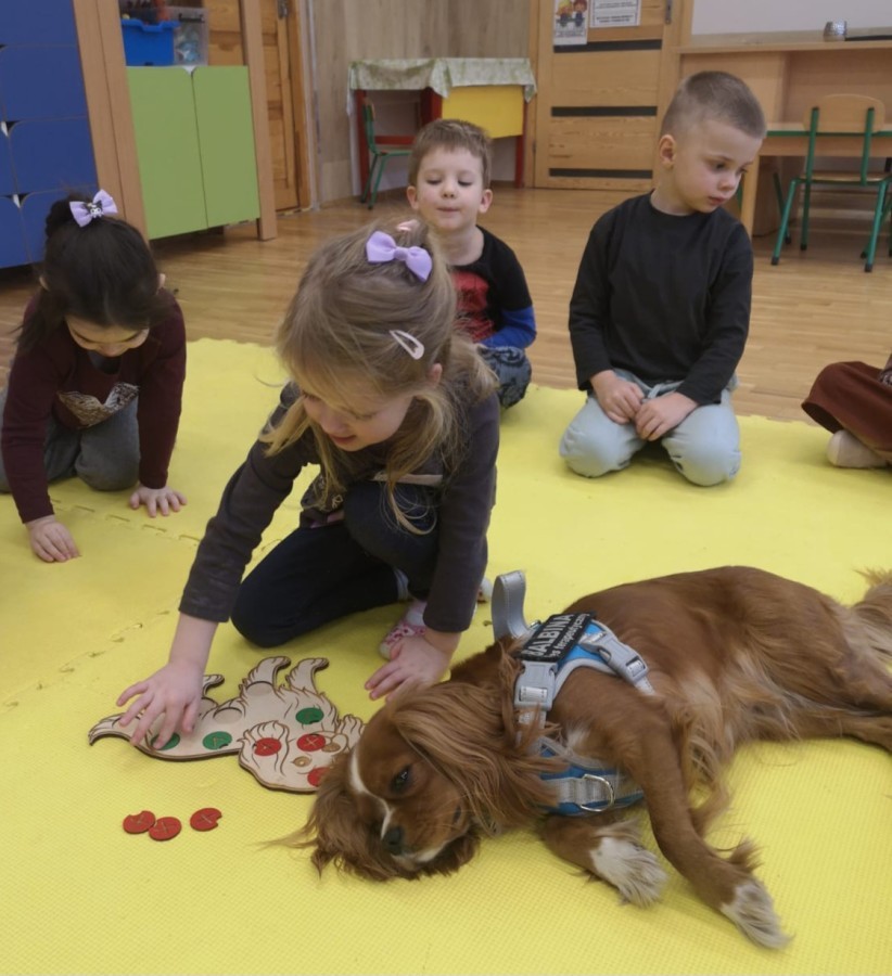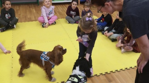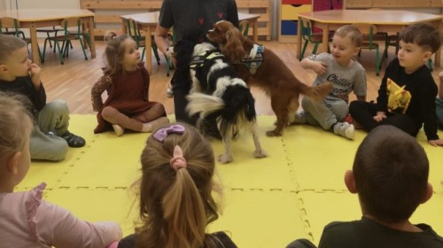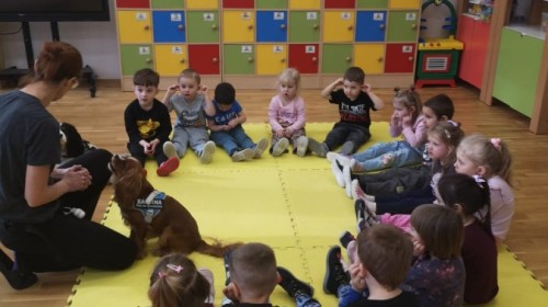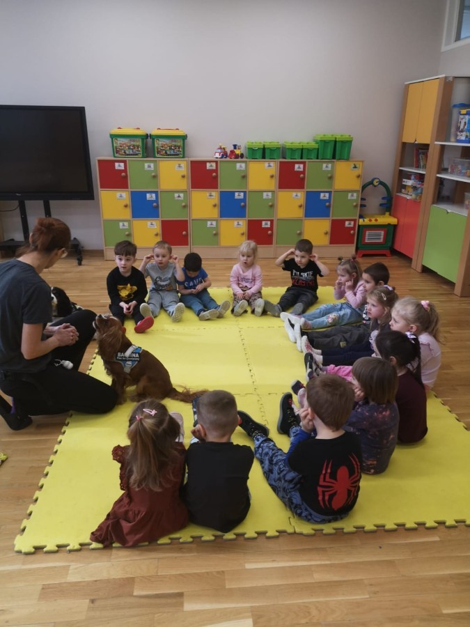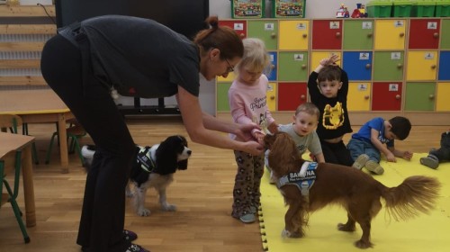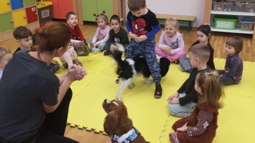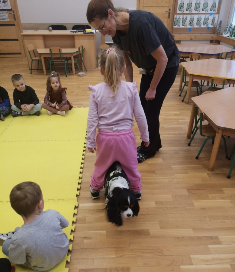 W grupie Myszek odbyły się zajęcia z dogoterapii, podczas których dzieci miały okazję do bezpośredniego kontaktu z psem terapeutą. Spotkanie przebiegało w miłej i bezpiecznej atmosferze, sprzyjającej nauce poprzez zabawę. Dzieci poznały zasady właściwego zachowania wobec psa, dowiedziały się, jak okazywać zwierzęciu szacunek oraz jak bezpiecznie się z nim bawić.