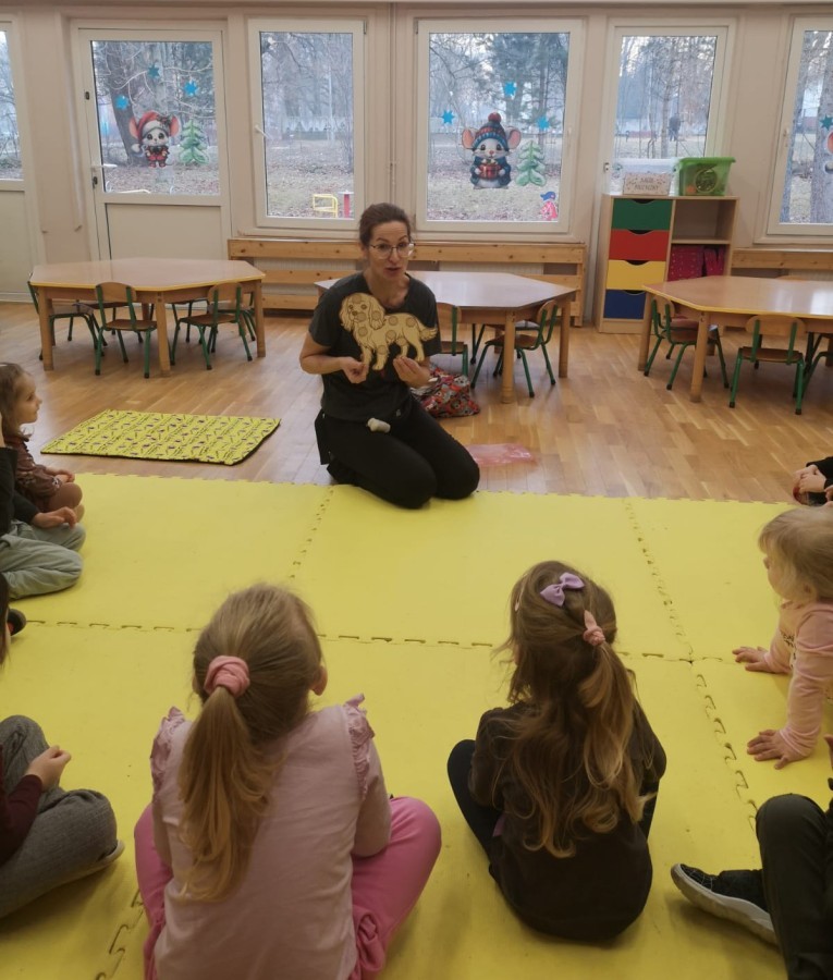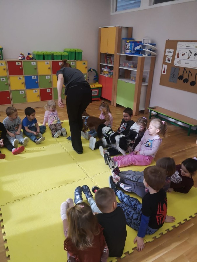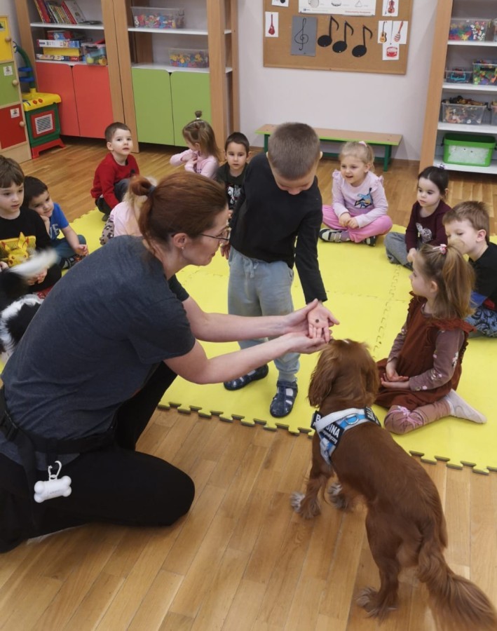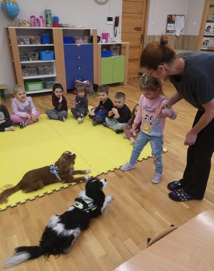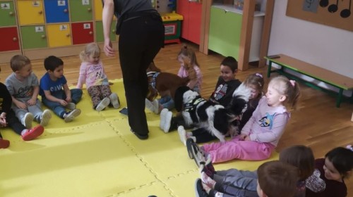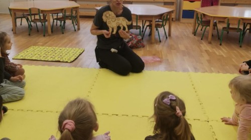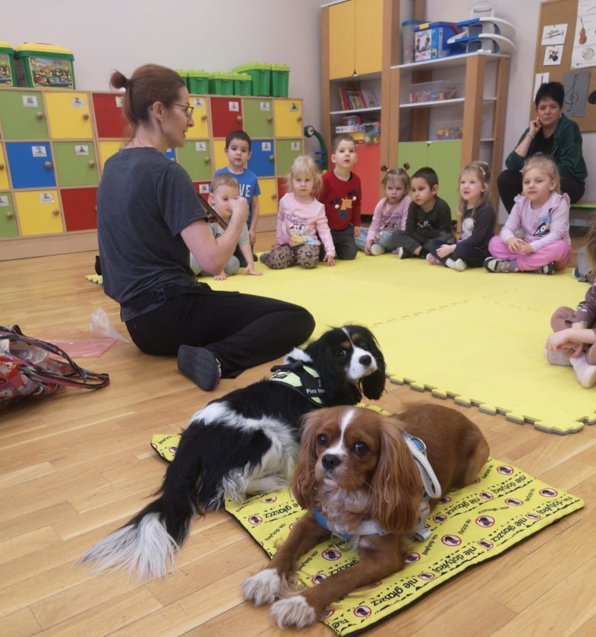 W grupie Myszek odbyły się zajęcia z dogoterapii, podczas których dzieci miały okazję do bezpośredniego kontaktu z psem terapeutą. Spotkanie przebiegało w miłej i bezpiecznej atmosferze, sprzyjającej nauce poprzez zabawę. Dzieci poznały zasady właściwego zachowania wobec psa, dowiedziały się, jak okazywać zwierzęciu szacunek oraz jak bezpiecznie się z nim bawić.