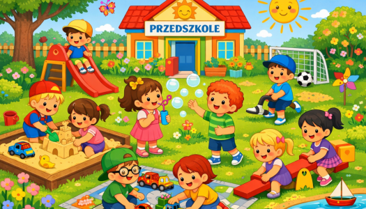 Dzieci bawiące się w ogródku przedszkolnym spędzają czas na świeżym powietrzu, gdzie mogą swobodnie biegać, wspinać się, zjeżdżać na zjeżdża...